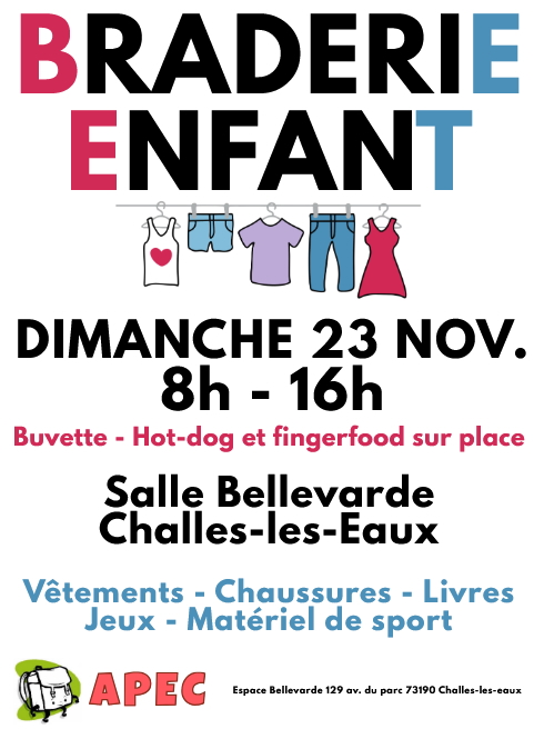 L'APEC organise à nouveau sa BRADERIE ENFANTS le DIMANCHE 23 NOVEMBRE de 8h à 16h à la salle po…