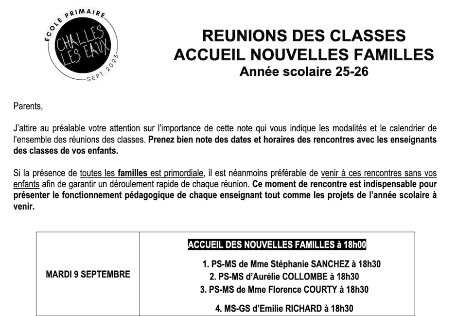 Veuillez trouver ci-dessous l'ensemble des DATES DES REUNIONS DE CLASSES.